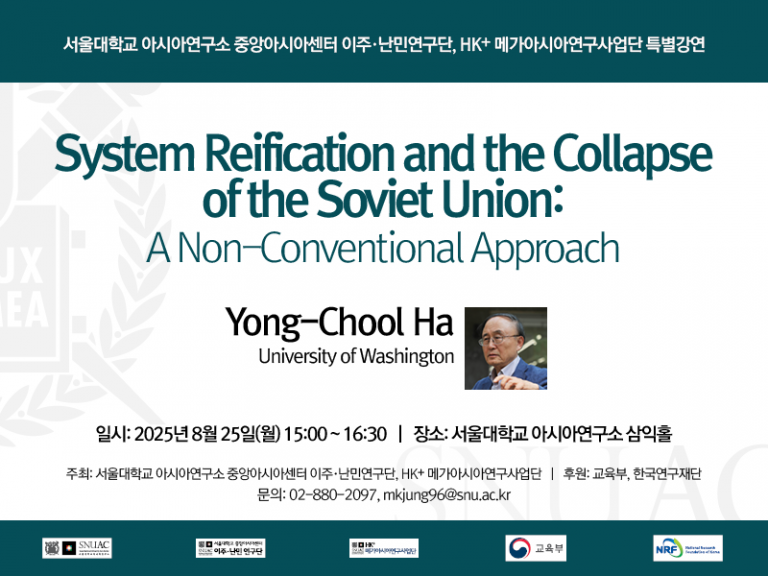 서울대학교 아시아연구소 중앙아시아센터 이주·난민연구단은 2025년 8월 25일 정치외교학부 명예교수인 하용출 교수(워싱턴대학교)를 초청하여 “System Reification and the Collapse of the Soviet Union: A Non-Conventional Approach”이라는 주제로 특별강연을 진행했다.
