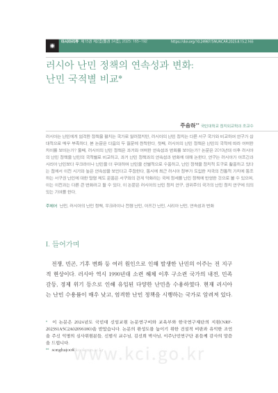 러시아는 난민에게 엄격한 정책을 펼치는 국가로 알려졌지만, 러시아의 난민 정치는 다른 서구 국가와 비교하여 연구가 상대적으로 매우 부족하다. 본 논문은 다음의 두 질문에 천착한다. 첫째, 러시아의 난민 정책은 난민의 국적에 따라 어떠한 차이를 보이는가? 둘째, 러시아의 난민 정책은 과거와 어떠한 연속성과 변화를 보이는가? 논문은 2010년대 이후 러시아의 난민 정책을 난민의 국적별로 비교하고, 과거 난민 정책과의 연속성과 변화에 대해 논한다. 연구는 러시아가 아프간과 시리아 난민보다 우크라이나 난민을 더 우대하며 난민을 선별적으로 수용하고, 난민 정책을 정치적 도구로 활용하고 있다는 점에서 이전 시기와 높은 연속성을 보인다고 주장한다. 동시에 최근 러시아 정부가 도입한 자국의 전통적 가치에 동조하는 서구권 난민에 대한 망명 제도 운용은 서구와의 관계 악화라는 국제 정세를 난민 정책에 반영한 것으로 볼 수 있으며, 이는 이전과는 다른 큰 변화라고 할 수 있다. 이 논문은 러시아의 난민 정치 연구, 권위주의 국가의 난민 정치 연구에 의의 있는 기여를 한다.