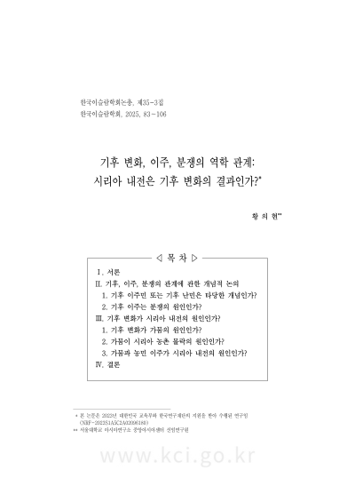 이 연구는 시리아 내전을 사례로 기후 변화, 이주, 분쟁 사이의 관계를 검토한다. 먼저 기후 난민 또는 기후 이주민이라는 개념의 타당성과 기후 변화, 이주, 분쟁의 관계에 관한 개념적 논의를 검토하고, 기후 변화가 이주와 분쟁에 미치는 영향을 다른 요인과의 관계 내에서 분석해야 한다는 점을 확인한다. 이어 개념적 논의를 토대로 시리아의 2006년 가뭄을 장기적 맥락 속에서 분석해 농촌 쇠락, 농민의 도시 이주, 도시의 사회경제적 문제 등 내전을 촉발한 요인으로 꼽히는 문제들이 가뭄으로 새롭게 만들어진 결과가 아니라 이전부터 존재하던 현상이며, 가뭄이 초래한 영향은 사회경제적 문제의 원인이 아니라 결과라는 점을 밝힌다. 시리아 내전은 기후 변화의 영향을 분쟁의 여러 요인 중 하나로서 다른 요인과의 관계망 내에서 분석할 필요성을 강조하는 사례다.